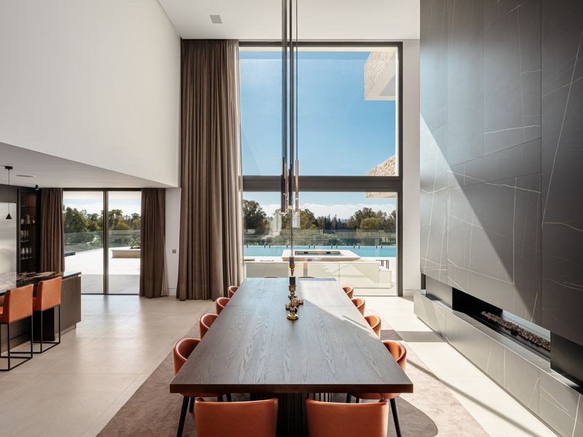La villa cuenta con una cocina contemporánea totalmente equipada, conectada sin fisuras a un espacioso comedor. Ambas áreas, junto con el luminoso salón, disfruta...n de abundante luz natural que entra a través de grandes puertas de vidrio, creando un diseño armonioso y bien definido. Una elegante chimenea aporta calidez y encanto al espacio. Pensada para la máxima comodidad, la casa también cuenta con un sótano con sauna privada, piscina interior, gimnasio, solárium y sala de cine, su propio retiro para entretenimiento y bienestar.