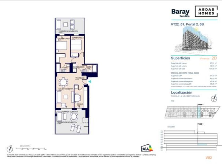 P2-Bajo B. Piso en una finca de obra nueva de 96 m2 de superficie construida y emplazado en la zona de Barañáin - Barañain. Está dispuesto en 2 habitaciones, 2 baños completos y terraza. El Piso dispone de portero automático. Cuenta como extras ascensor y trastero.